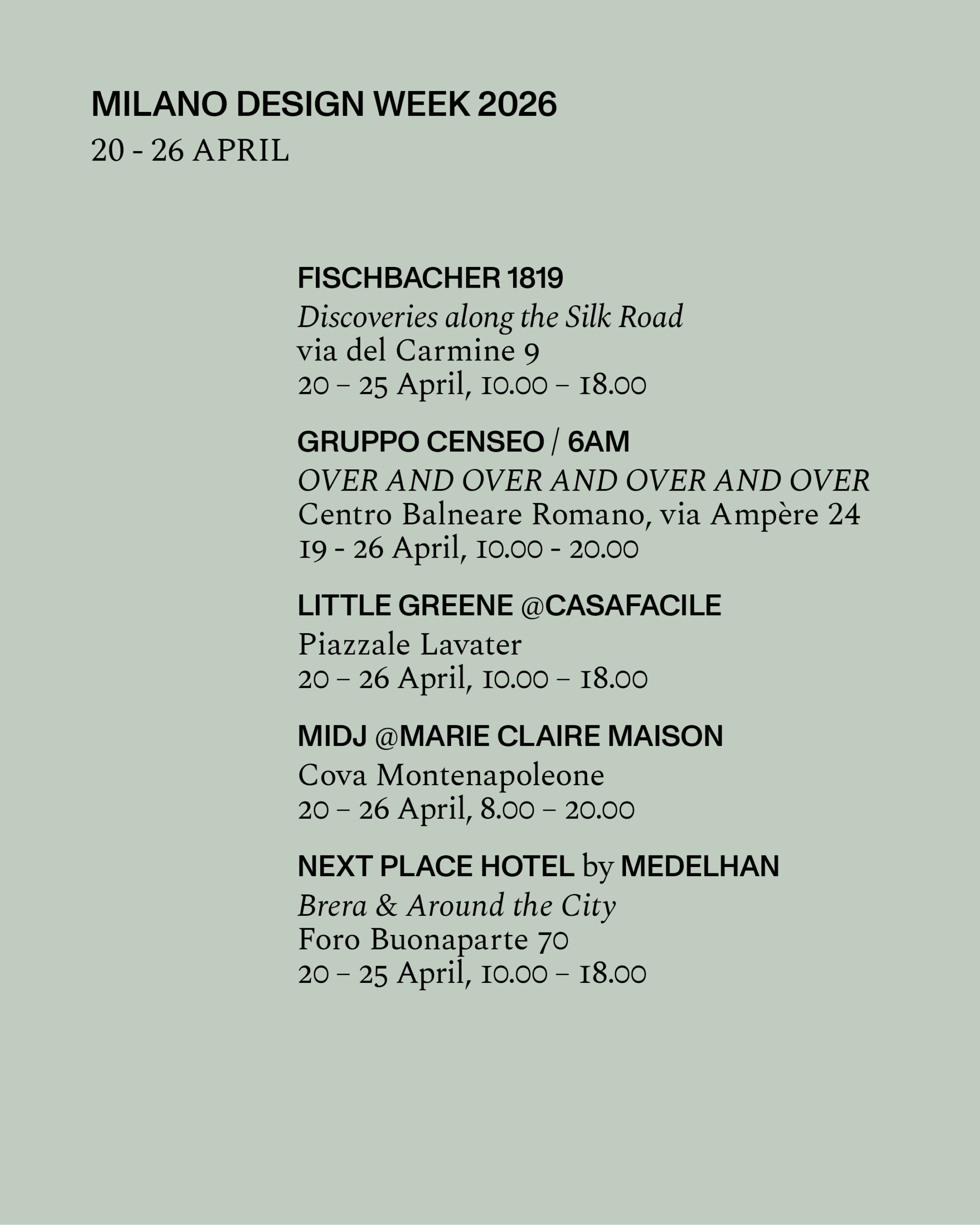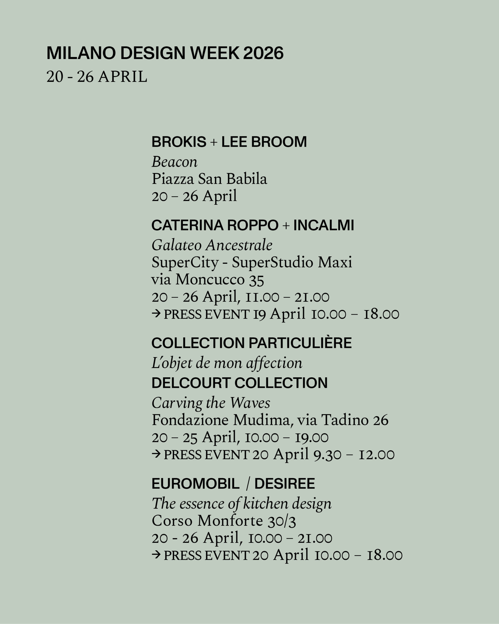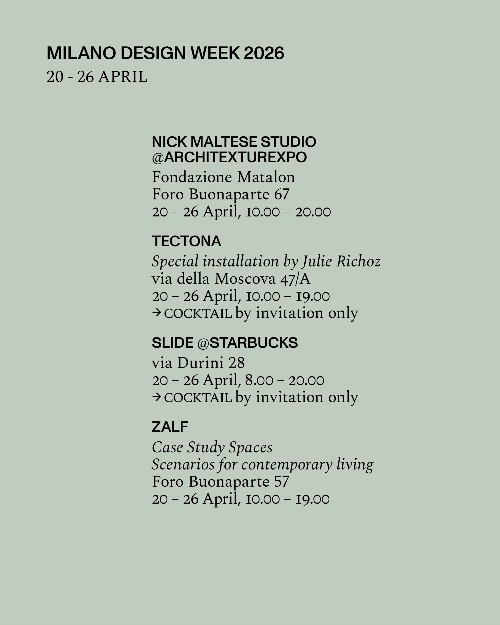 via Durini 28 20 – 26 April, 8.00 – 20.00 COCKTAIL by invitation only